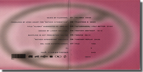 is the first release on Rather Interesting and at the same time representing the direction this new German label is going to take: no style is holy, no crossover that is not possible. Flextone combines house-rhythm fragments, tribal sequences with flowing, mellow structures of astonishing beauty. Somewhere between ambient and Chicago, Flextone for sure is intelligent. Tracks like the opener "Alaska" or "Lifesize" are made for the frozen dancefloor while "Afterwards I Felt Better" or "Sound" let you have a glimpse of an idea how the human brain works by drifting away in a digital partition. Where the boundaries of ambient and house lay, Flextone begins. Produced by Atom Heart, Flextone proves its visionary character and shows the future of electronic music.